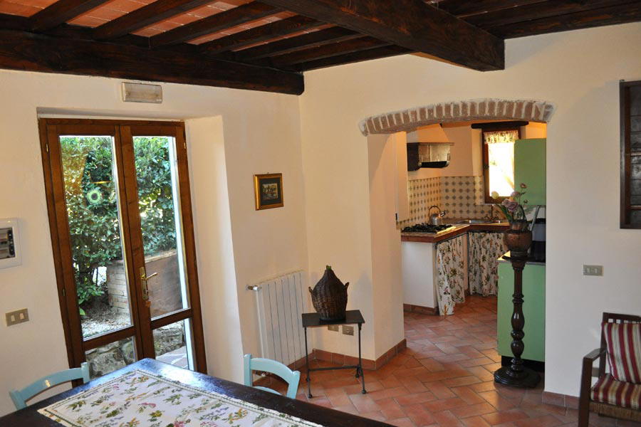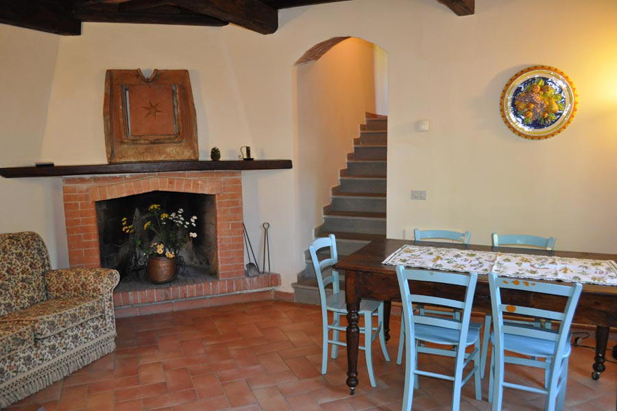 Al piano terra troviamo l'angolo cottura completamente attrezzato ed il soggiorno con il caminetto in tipico stile toscano, perfetto per cucinare una bella fiorentina.