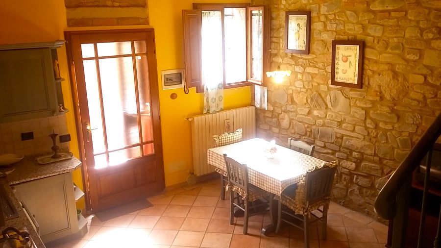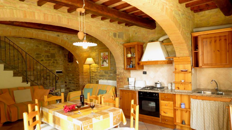 Il più piccolo dei quattro è Granaio, ideale per una coppia o una famiglia con un bambino piccolo; anch'esso è dotato di un'area esterna esclusiva con il pavimento in terracotta ed una cucina attrezzata con tutto il necessario, tra cui la lavastoviglie. Particolarmente grazioso è il bagno con la doccia, dove parte delle pareti sono in pietra.