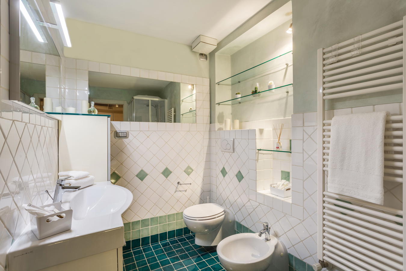 Situato al piano terra, l'appartamento è dotato di un bagno extra large arredato in toni neutri con qualche dettaglio dai colori più brillanti e luminosi. Oltre al lavandino, al bidet ed al wc, è presente una doccia con fantastico idromassaggio, per rilassarsi una volta di ritorno a casa dopo aver esplorato le meraviglie di Firenze e della Toscana. La biancheria - da letto, da bagno e da cucina - è fornita e compresa nel prezzo, ma se vuoi utilizzare il divano letto, ricorda di avvisare prima del tuo arrivo il proprietario in modo che possa farti trovare le lenzuola (il divano letto misura 140x200 cm).