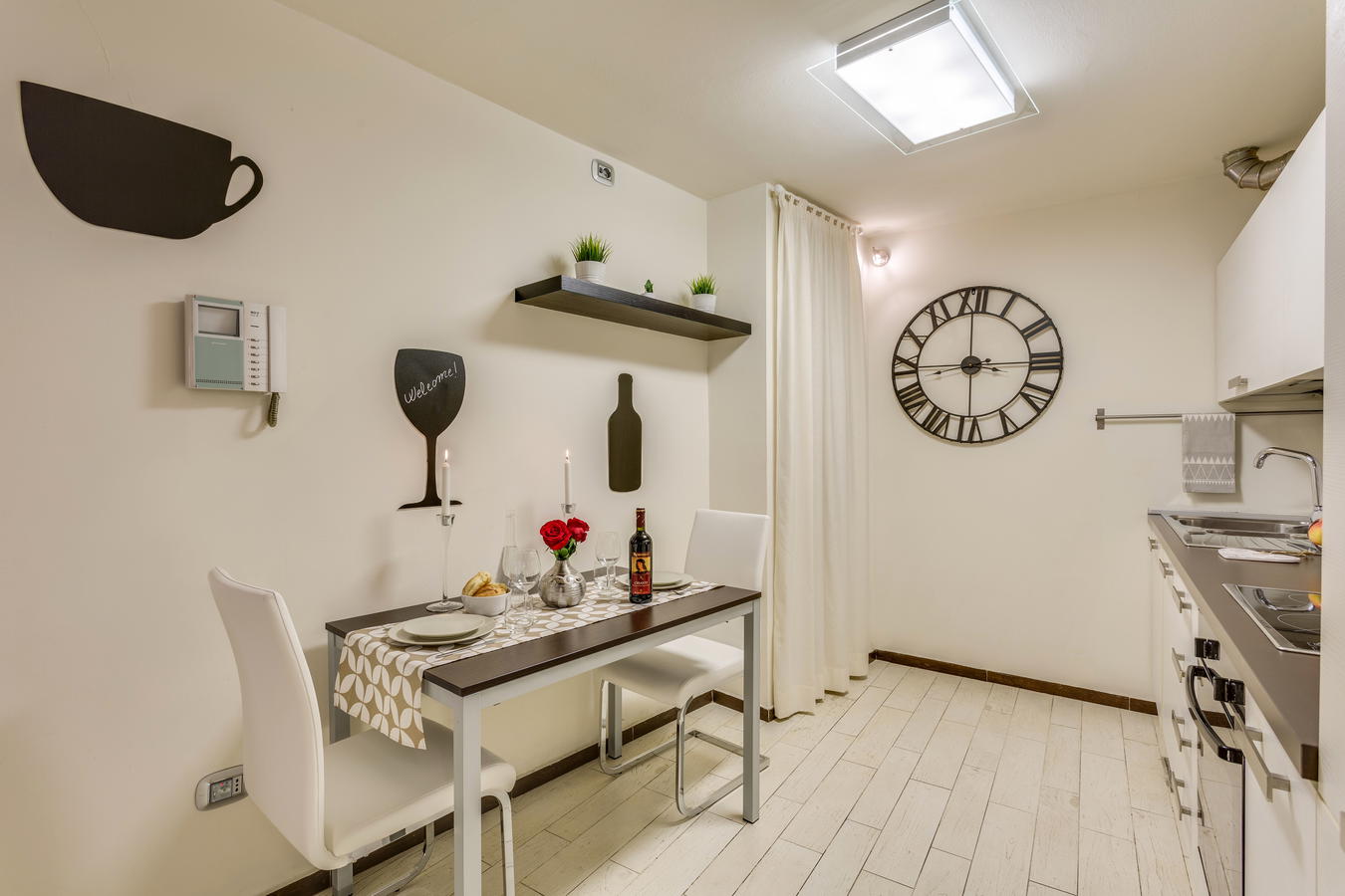 Con una piacevole continuità di colori, il soggiorno lascia spazio all'angolo cottura completamente attrezzato per preparare pranzi e cene in autonomia, dopo aver acquistato i tipici prodotti toscani al mercato della frutta e della verdura, i vino, il pane fresco e qualche affettato presso i negozi situati a brevissima distanza. L'appartamento dispone di lavatrice e della macchina del caffè.