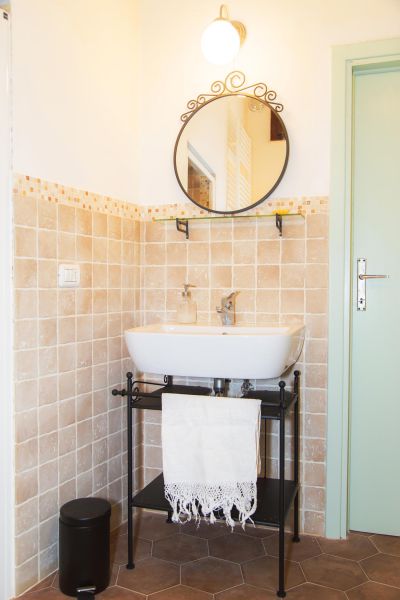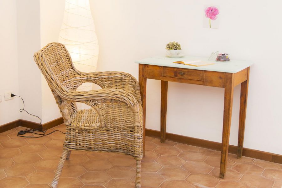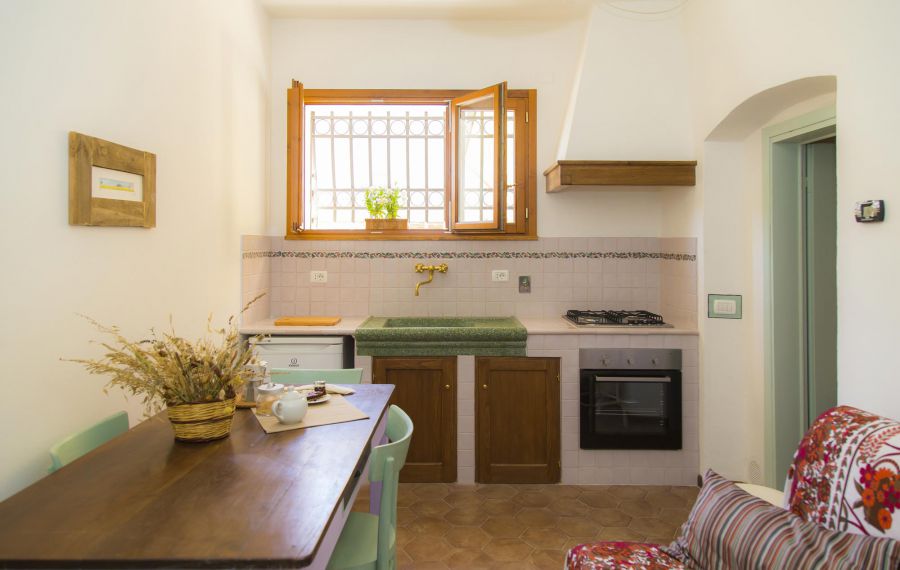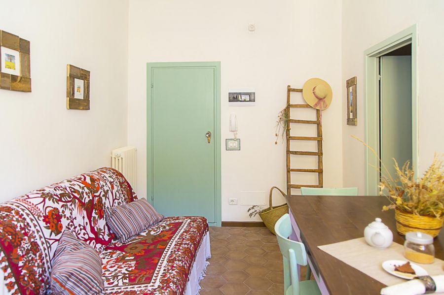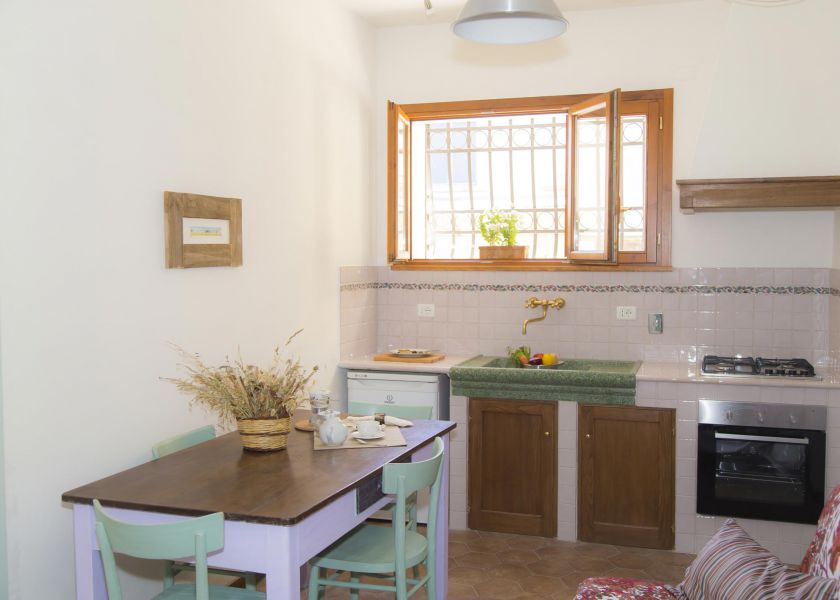 L'appartamento è composto da due stanze ed un ampio bagno. La stanza più grande ha un cucinotto dove troverete tutto il necessario per prepararvi da mangiare, magari con i prodotti locali presi al mercato. Il lavello in pietra dà un tocco speciale all'ambiente e ricorda le tipiche coloniche toscane. Non mancano neanche le comodità moderne, come il frigorifero, il piano cottura ed il banco da lavoro. Ci sono inoltre un bel tavolo in legno ed un divano letto, che può essere utilizzato a necessità.