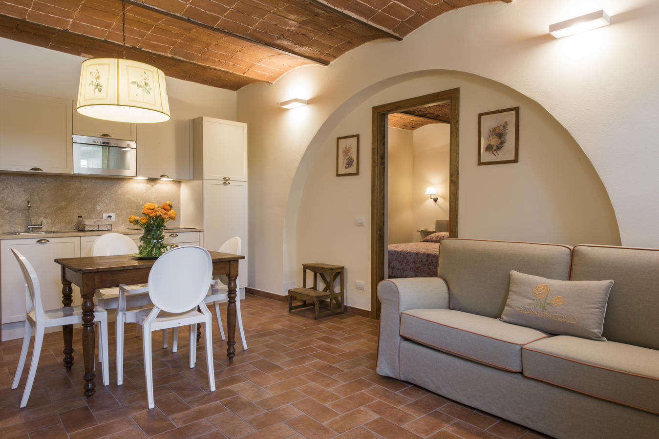 I 12 appartamenti self catering sono situati sia al piano terra che al primo e possono ospitare da 2 a 7 persone. Ogni appartamento è diverso dagli altri ed è caratterizzato da dettagli architettonici originali che ne esaltano l'antica bellezza, come i gradini in pietra serena, i soffitti con i travi a vista, i caminetti in stile tradizionale e gli archi, anch'essi in pietra. La maggior parte degli appartamenti è composta da soggiorno con divano letto, cucina dedicata, una camera matrimoniale e bagno completo. Calla è il più grande degli appartamenti e, con le sue due camere da letto e due bagni, può ospitare fino ad un massimo di 7 persone.
