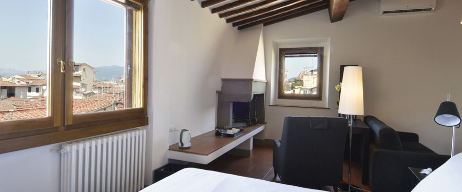 La più grande delle camere, la Suite Santo Spirito, si trova all'ultimo piano e vanta di un panorama davvero unico sui celebri tetti rossi di Firenze, con vedute spettacolari sul Duomo, Santo Spirito e Palazzo Pitti. Ciò che contraddistingue questa camera è l'area soggiorno creata appositamente per rilassarsi e vivere qualche momento di pace e tranquillità leggendo un libro, bevendo una tazza di tè o aggiornando il proprio diario di viaggio. La camera executive Duomo ha un bagno privato con un'ampia cabina doccia con porta a vetri ed un grande soffione multi-getto, un comodo salottino ed un letto matrimoniale.