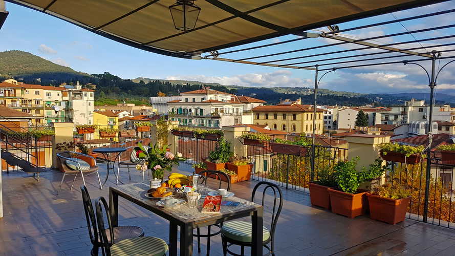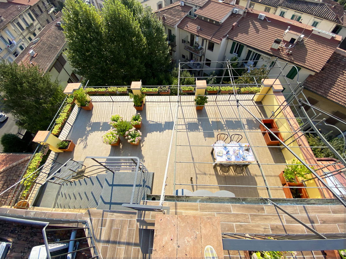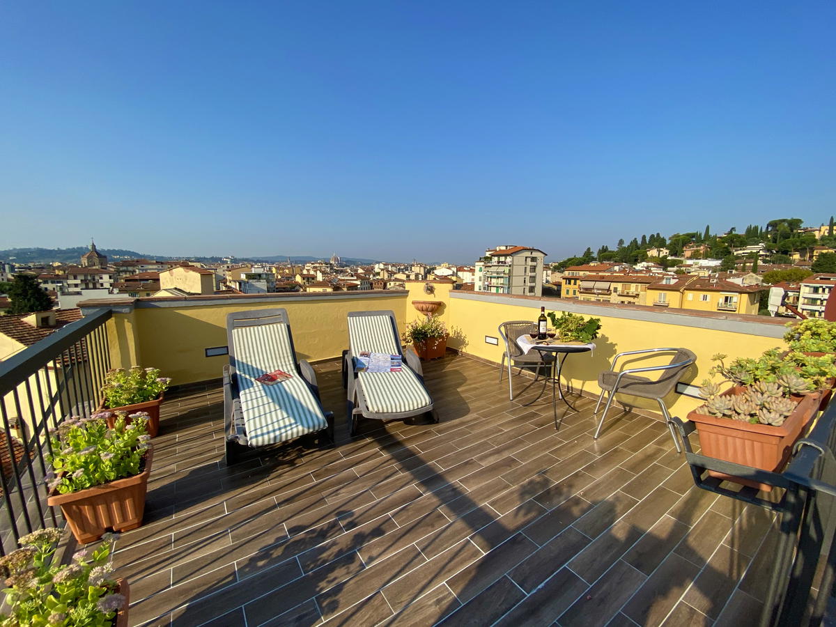 I fiori all'occhiello dell'appartamento Terrazza con Vista sono le sue due terrazze - e non sottovalutare quanto possono arrivare a rendere davvero unico e speciale il tuo soggiorno a Firenze! Vista magnifica ad ogni ora del giorno e della notte, colazioni, pranzi e cene all'aperto, con il profilo di Firenze che si estende all'orizzonte, un romantico tramonto con un buon bicchiere di prosecco. Le terrazze sono dotate di tavoli e sedie per mangiare fuori, così come di sdraio per godere del massimo relax sotto il sole di Toscana.