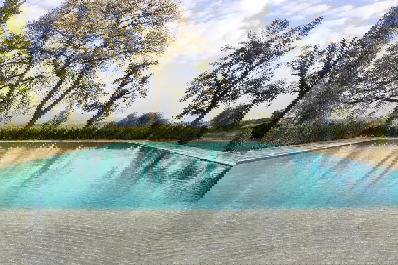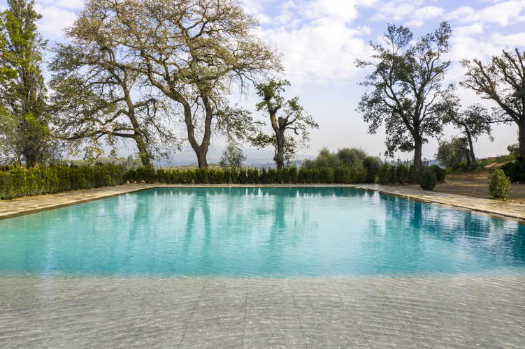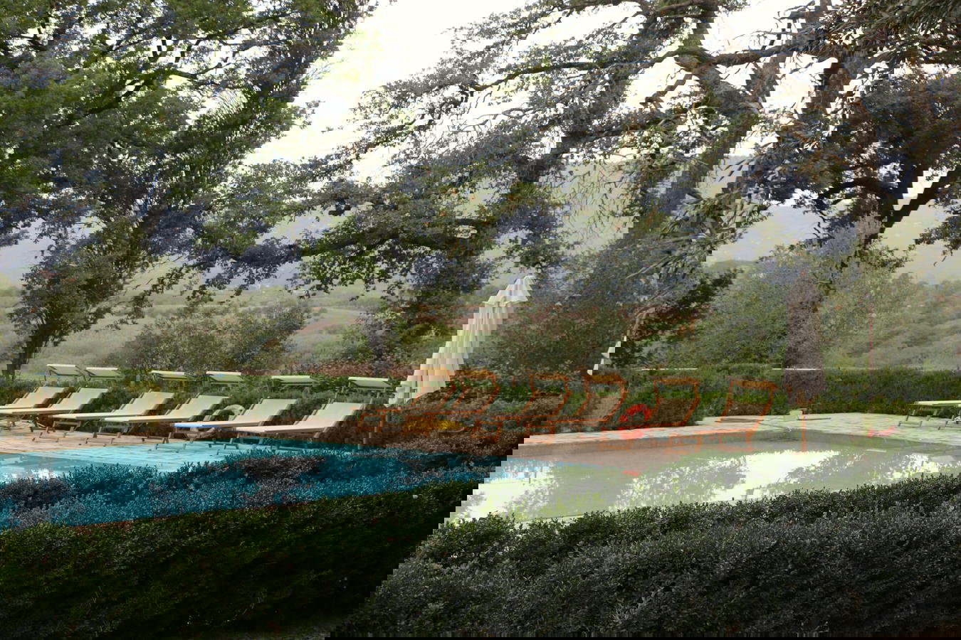 La villa è circondata da un bellissimo ed ampio giardino con tanti angoli e spazi con comodi sedute all'aperto per godersi la vista dei boschi, vigneti ed uliveti della tenuta. La piscina offre splendide viste panoramiche sulle colline circostanti ricoperte di vigneti ed è una zona tranquilla e rilassante in cui godersi il sole della Toscana.